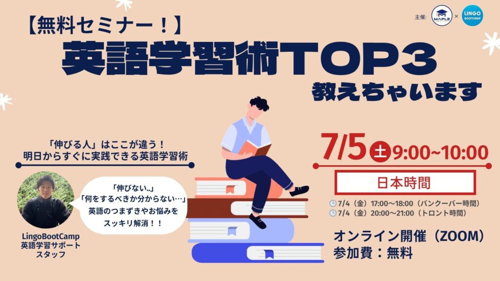 そんな不安や迷いを抱えるあなたに向けて、今回 英語スピーキング特化アプリ「リンゴブートキャンプ」xメープルエデュケーション留学センターが、特別オンラインイベントの開催を決定!!